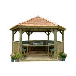 Forest Garden Furnished Timber Roof Hexagonal Gazebo, (W)4900mm (D)4240mm (Green Cushion Included)