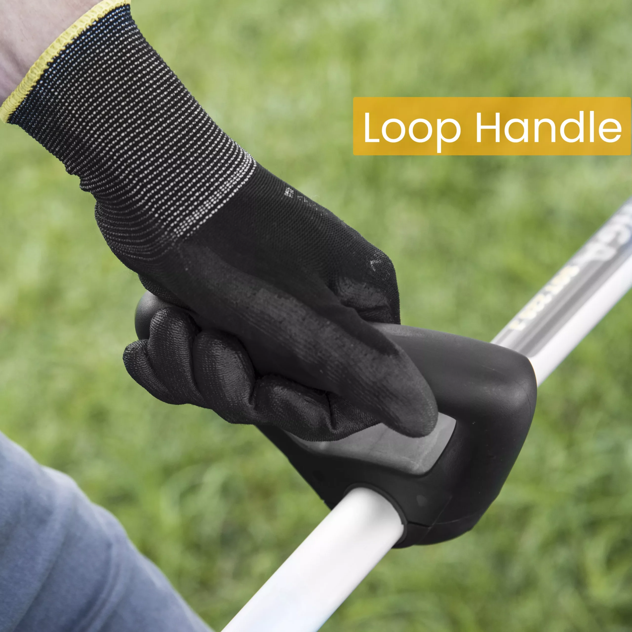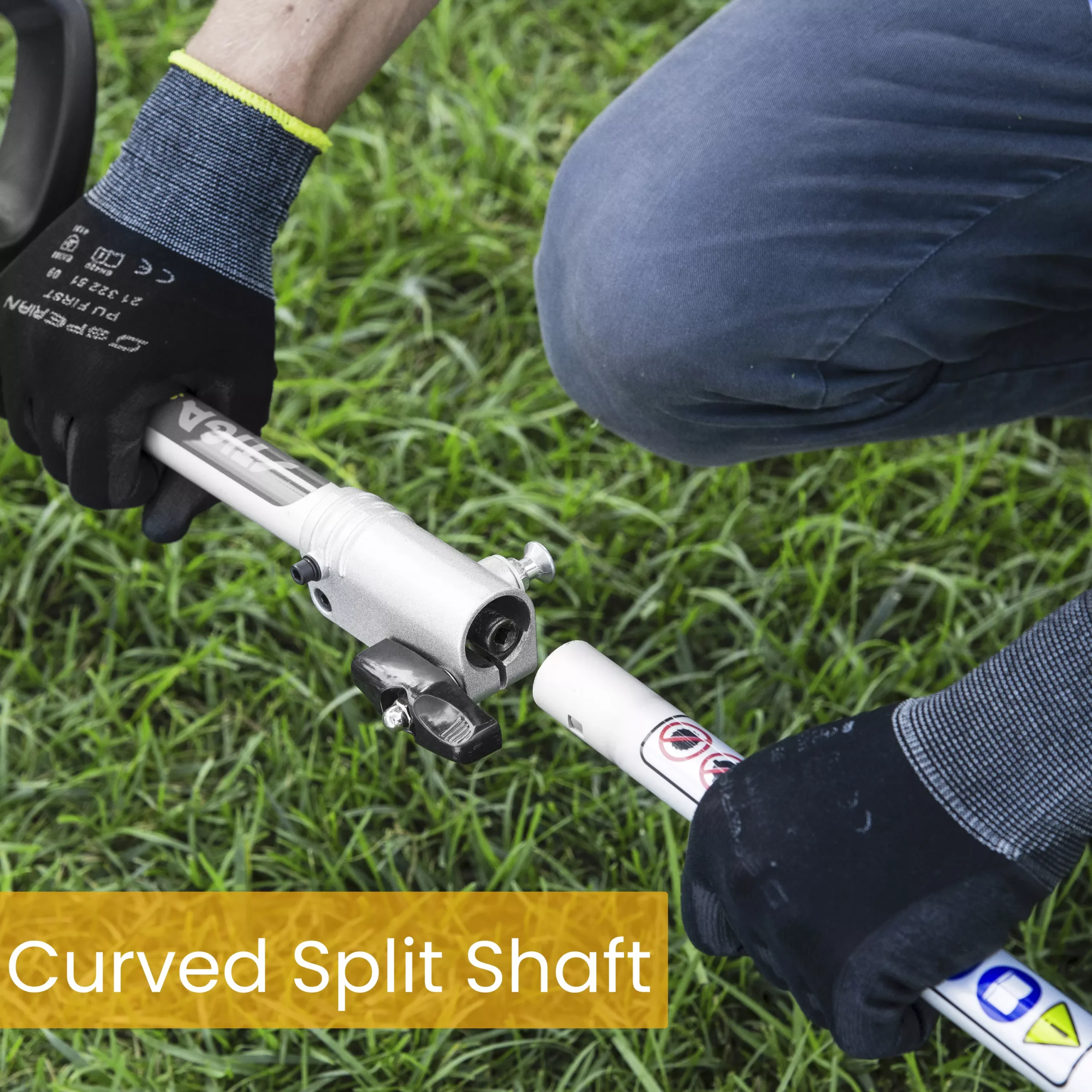 - Curved shaft for easy trimming around lawns and flowerbeds